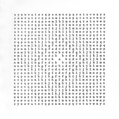 For example, Emmett Williams’s Mediation No 2. Uses the whole alphabet with A at the center, Z at the corners and all the letters in between radiating out. What I love about this is how the repeating letterforms create this diamond pattern within the square composition. Another example is his Sweethearts piece. There’s something to the spaced out characters that fit inside this square shape that made me think this could be an interesting way to showcase certain letterforms.